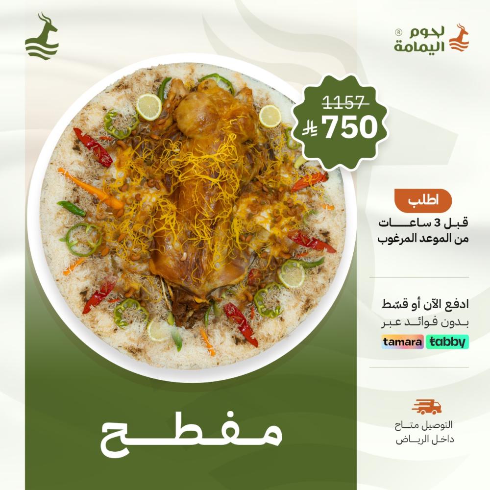 تبغى شي يشرّف بالعزيمة؟ جرّب المفطح اللي يرضي الذوق الرفيع. لحم طري، متبل بتوابل تقليدية، ومطبوخ على نار هادية عشان يعطيك طراوة وعصارة ما تنسى. ويتقدم مع رز فاخر مزين بالمكسرات والخضار، يفتح النفس من أول نظرة!